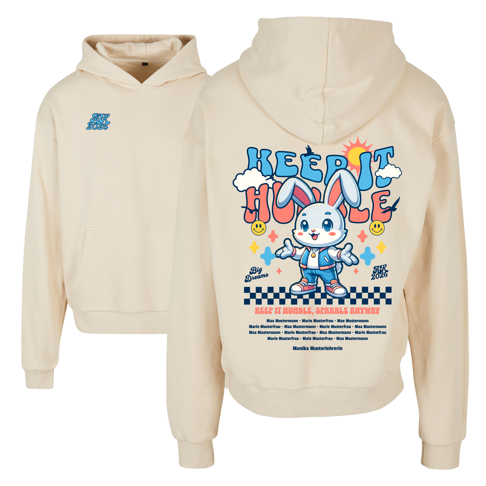 Die Druckfarbe des Motivs und der Namensliste ist auf allen Textilien frei wählbar.